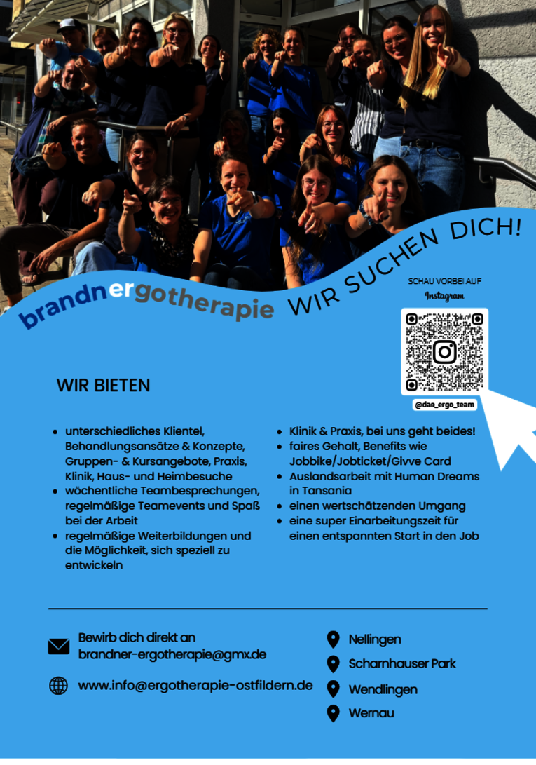 Als Verstärkung in unserem Team, in dem mit gegenseitiger Wertschätzung gearbeitet wird. Wir haben vier Praxisstandorte und sind in Kooperation mit einem Klinikverbund, in den Abteilungen Neurologie mit Stroke Unit und Geriatrie. Die Schwerpunkte der Praxen liegen in der Pädiatrie, Neurologie und Handtherapie. Die unterschiedlichen Schwerpunkte und die Kooperation mit der Klinik macht die Arbeit bei uns sehr vielseitig und Abwechslungsreich. Bei uns hat jede und jeder die Möglichkeit sich mit seinen Stärken einzubringen und die Praxis und die Behandlungsmethoden mitzugestalten. Wir legen Wert auf gutes Teamwork, daher gibt es bei uns wöchtentliche fachspezifische Teamsitzungen. Wir bieten dir gute Entwicklungsmöglichkeiten nach individuellen Wünschen in die Richtgungen Handtherapie, Neurologie (Kooperation mit Stroke Unit) und Pädiatrie (unter anderem Neurofeedback). Für Berufseinsteiger und Berufseinsteigerinnen bieten wir wöchentliche Teamzeiten mit erfahrenen Kollegen um dir so einen möglichst guten und stressfreien Einstieg in diesen großartigen Beruf zu ermöglichen.